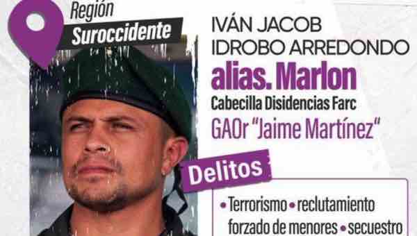 "Marlon", whose real name is Ivan Jacob Idrobo Arredondo, is suspected of having ordered Saturday's bomb attack on the Pan-American Highway, in which 20 people were killed. The attack is one of the deadliest targeting civilians and comes just over a month before presidential elections scheduled for 31 May.